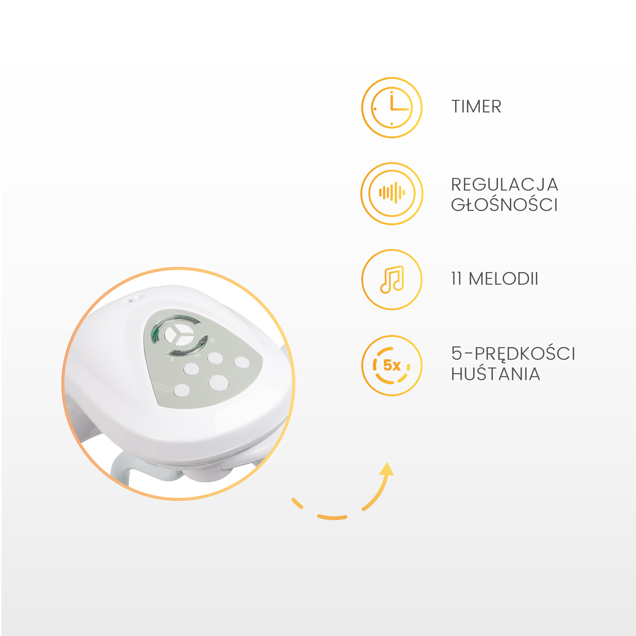 | 5-STOPNIOWA REGULACJA PRĘDKOŚCI BUJANIA Możliwość wyboru spośród pięciu prędkości bujania pozwala dostosować ruch huśtawki do potrzeb maluszka, oferując delikatne lub bardziej energiczne bujanie. Czasomierz umożliwia automatyczne wyłączenie urządzenia po 8, 15 lub 30 minutach. | ![]() |
