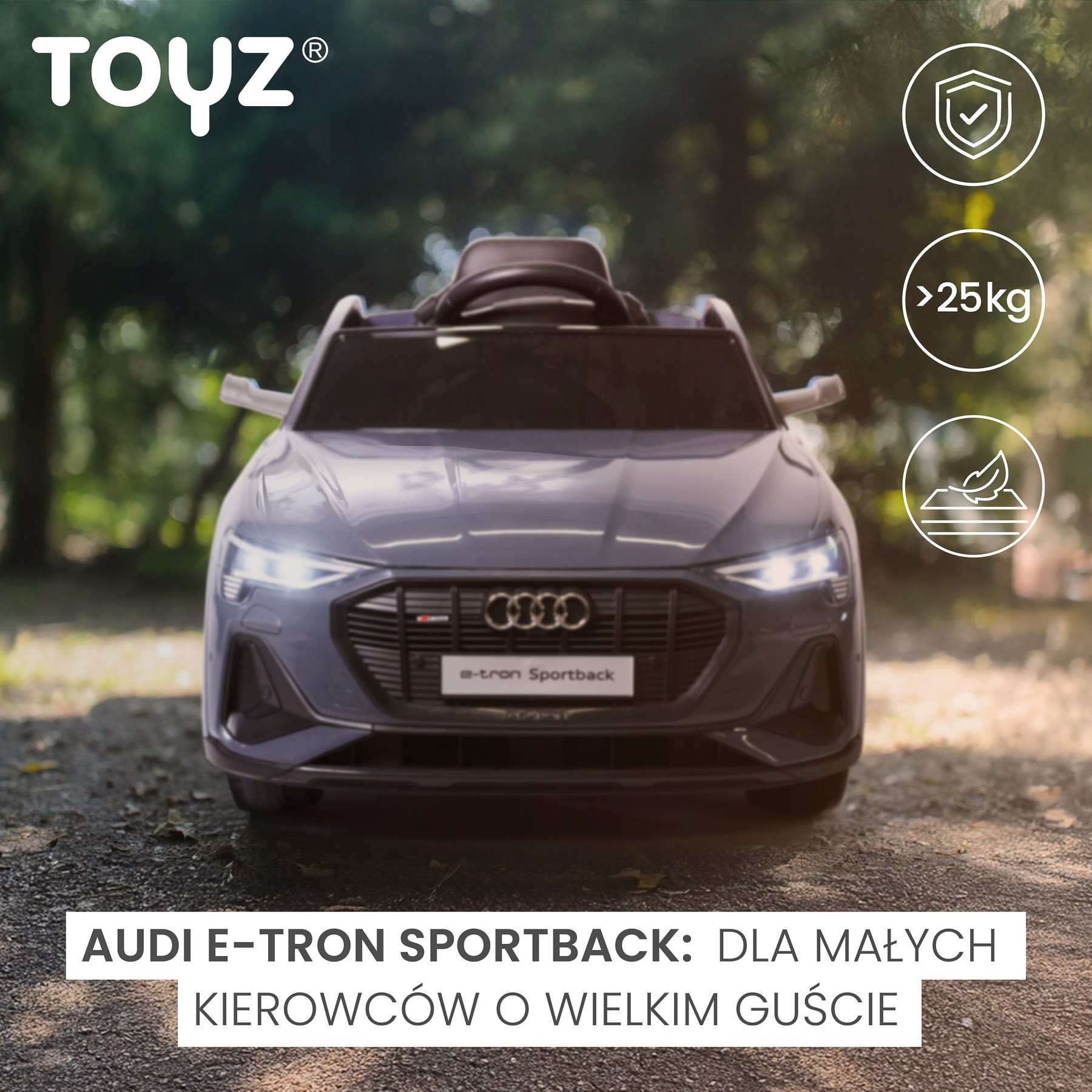Audi E-tron Sportback to licencjonowany pojazd na akumulator marki Toyz, który łączy elegancki design z dynamiką elektrycznego napędu. Model wyróżnia się charakterystyczną dla Audi linią nadwozia, nowoczesnymi wąskimi lusterkami oraz łączoną tylną belką świateł. Wewnętrzną siłą modelu E-tron Sportback jest napęd na 4 koła z silnikami 45 W. Są one zasilane akumulatorem o pojemności 7 Ah. Komfort i bezpieczeństwo zabawy zapewniają: tylne amortyzatory, koła z wysokiej jakości pianki EVA, fotel z ekoskóry, 3 punktowe pasy, wolny start, dwa tryby prędkości i automatyczny hamulec. Akumulatorowiec posiada również ułatwienia dla rodziców: pilot zdalnego sterowania oraz chowane kółka ułatwiające przenoszenie.