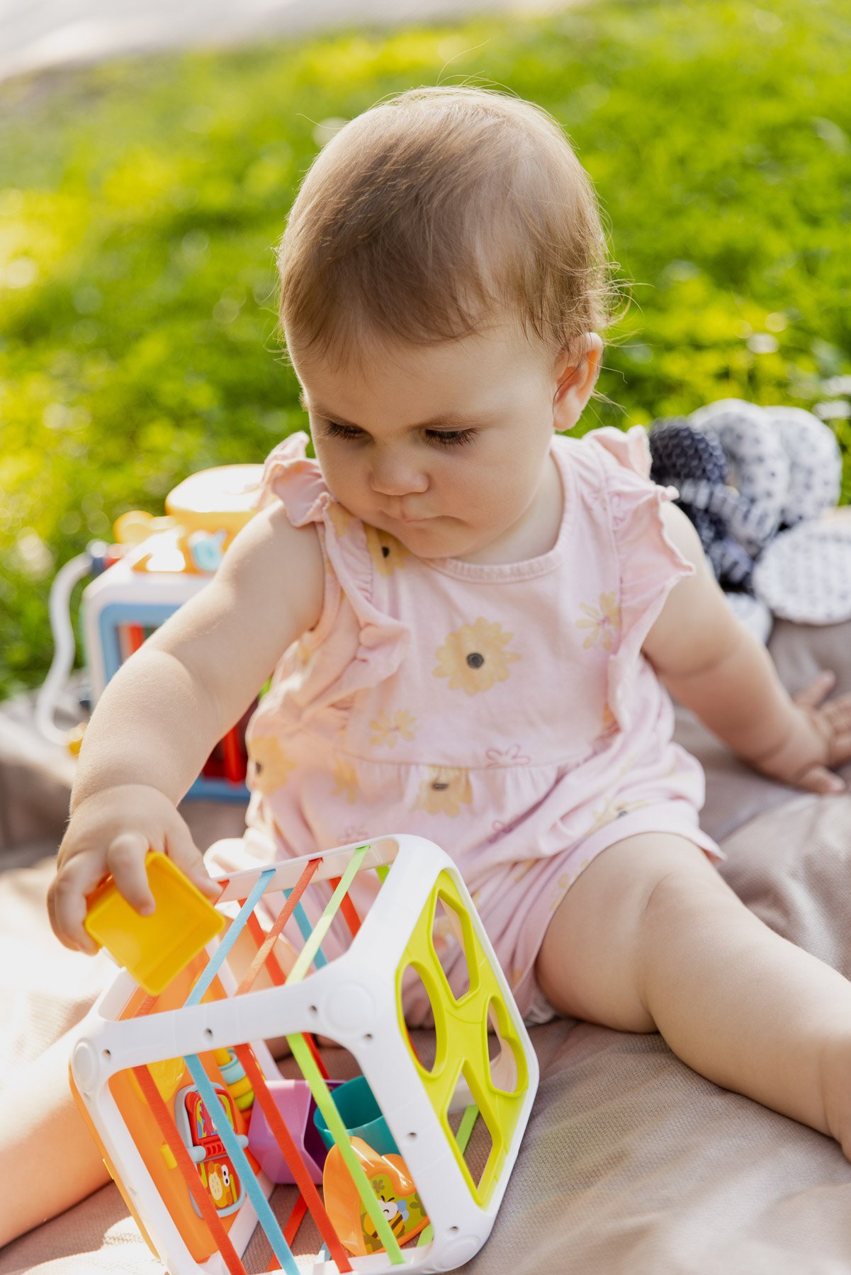 Kostka Sorter to świetna logiczna zabawka edukacyjna dla najmłodszych. Jest wyposażony w 4 kolorowe klocki pasujące do otworów w pokrywie. Dwustronny panel z zabawkami edukacyjnymi urozmaici czas maluszka. Zabawka jest odpowiednia dla dzieci w wieku powyżej 18 miesiąca życia.