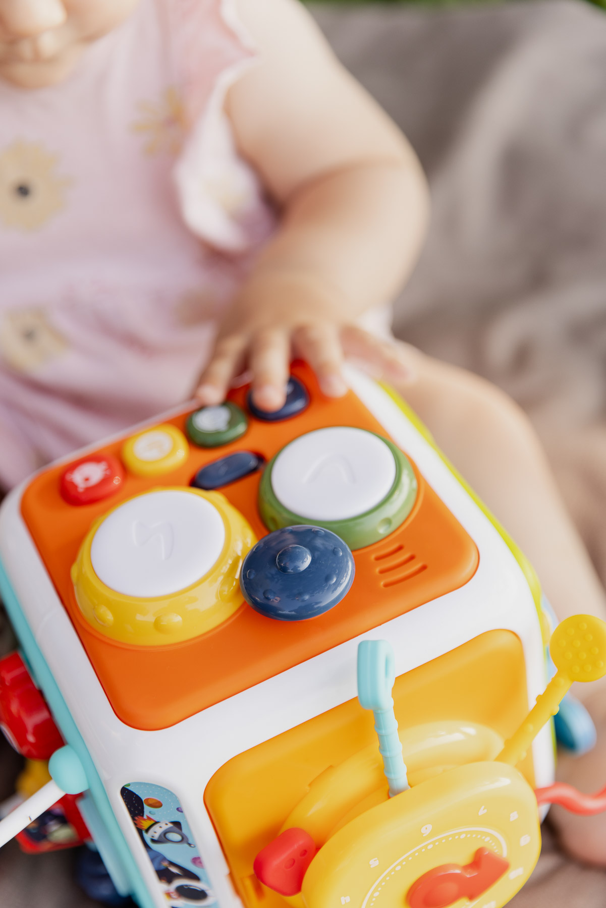Mini perkusja, zachęca do odkrywania różnych rytmów. Dzięki różnym powierzchniom do uderzania dziecko poznaje nowe dźwięki , rozwija poczucie rytmu oraz koordynację wzrokowo-ruchową. Mini pianinko z czterema kolorowymi klawiszami, po naciśnięciu wydają przyjemne dźwięki oraz krótkie, wesołe piosenki.