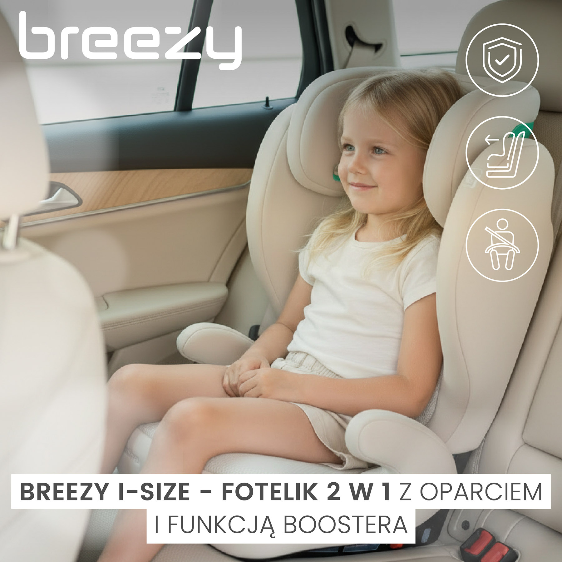 Безпека підтверджена стандартом i-Size Автокрісло Breezy забезпечує найвищий рівень захисту, відповідаючи суворим вимогам стандарту i-Size, який включає сучасні краш-тести та вдосконалений захист від бокових ударів.